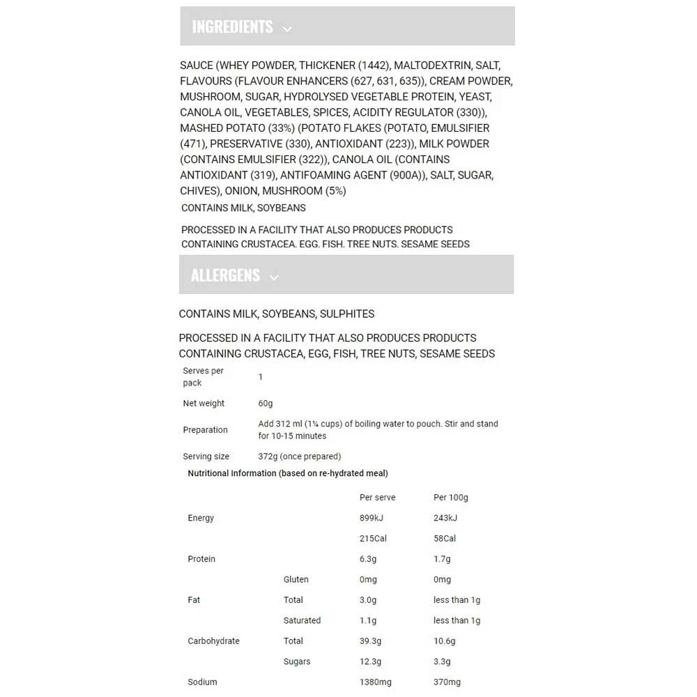 This heartwarming dish consists of mushroom soup with creamy mashed potato. Just add the required amount of hot water to the resealable pouch, and your soup with be ready in 10 minutes.