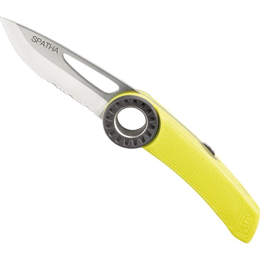 The SPATHA clippable knife is designed to accompany the climber on every outing. The profile of the blade allows easy cutting of ropes and cordage. It has a hole for a carabiner to attach it to the harness. It is easy to manipulate with its textured wheel, even when wearing gloves, and can be locked in the open position.